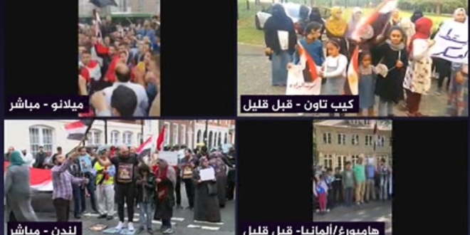 وشهدت مدن ميلانو في إيطاليا وبرلين في ألمانيا وكيب تاون بجنوب إفريقيا، وأمستردام في هولندا، ولندن في بريطانيا تظاهرات حاشدة للمطالبة برحيل السيسي.