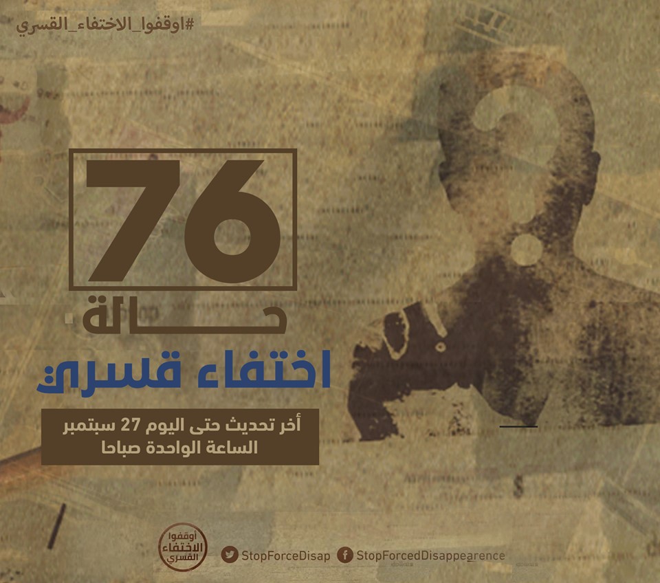 وثق التقرير اليومي لغرفة طوارئ المفوضية المصرية للحقوق والحريات، بالتنسيق مع حملة أوقفوا الاختفاء القسري، 76 حالة اختفاء قسري تراوح عدد أيام اختفائهم حتى الآن ما بين 3 أيام و 6 أيام، حيث تم توثيق تاريخ اختفاء 56 شخصا من بينهم منذ يوم 20 سبتمبر الجاري، بينما هناك 16 حالة تم إخفاؤهم منذ 21 سبتمبر، تم إخفاء 4 أشخاص خلال يومي 22 و 23 سبتمبر.