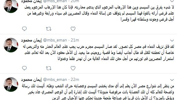 وأضافت محمود: "لقد فاق نزيف الدماء في مصر كل تصور. لقد صار السيسي مجرم حرب يجب على العالم الحذر منه والتربص له خاصة أن تعطشه للقتل قد طال أجانب أيضا وما قضية روجيني منا ببعيد. إن الأمل معقود الآن بعد الله تعالى على استمرار المصريين في ثورتهم من أجل حقن تلك الدماء الغالية من أن تهدر ظلما وعدوانا".