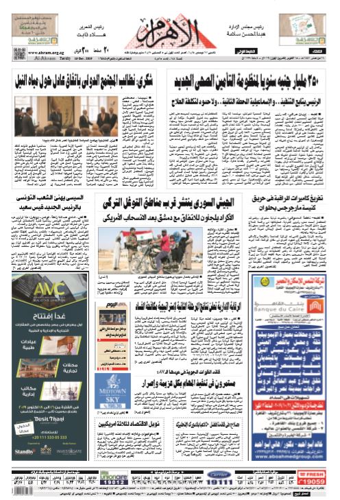 أولا، تواصل الحملة السوداء والضارية على تركيا ووصف حملتها العسكرية ضد تنظمي داعش وبي كاكا بالعدوان رغم قبول نظام العسكر وسكوته على الاحتلال الروسي لسوريا وكذلك القوات الأمريكية والفرنسية وغيرها وكذلك عدوانه على ليبيا عبر دعم مليشيات حفتر وعدوان السعودية والإمارات على اليمن. حيث جاء في «الأهرام»:.. (الجيش السوري ينتشر قرب مناطق التوغل التركي ..الأكراد يلجأون للاتفاق مع دمشق بعد الانسحاب الأمريكي). وفي «مانشيت اليوم السابع»:.. (العقوبات الاقتصادية.. صفعة جديدة لـ "الديكتاتور العثمانى".. الجيش السورى والأكراد "إيد واحدة" فى مواجهة الاحتلال.. سوريا الديمقراطية تتحالف مع "بشار" فى مواجهة العدوان التركى.. وقوات الجيش السورى تتمركز بمدن الشمال .. واشنطن تدرس "رد قاسى" ضد أنقرة بسبب العدوان على سوريا.. تقارير غربية: قادرة على تدمير اقتصاد تركيا.. ووزير الخزانة الأمريكى: جاهزون لإقرارها فى أى لحظة).. ويزعم «مانشيت اليوم السابع»:.. (العدوان التركي سافر ومن حق السوريين الدفاع عن النفس.. وزير الخارجية المصري يؤكد: المجتمع الدولي عليه دور في التوصل لاتفاق عادل في ملف سد النهضة ويدعو للتوصل إلى حل سياسي في الأزمة الليبية). وبحسب «الوطن»:.. (أردوغان مجرم حرب… الأكراد يجهضون مخططات تركيا.. قوات سوريا الديمقراطية تسلم المنطقة الحدودية للجيش العربي السوري .. والأسد: غلبوا مصلحة الوطن والأولوية حاليا ضد العدوان.. دبلوماسي روسي سابق: سيطرة الجيش على الحدود خطوة إيجابية لوقف التوسع التركي والرهان على الأمريكيين خاسر.. قوات الجيش العربي تنتشر في شمال سوريا لمواجهة العدوان التركي.. وزير الخارجية: جهود مصرية لإنهاء معاناة الشعب السوري)..