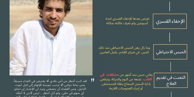 ونقل شاهد عيان من أفراد أسرته، وكان فى زيارته أمس الاثنين، واصفًا وضعه الصحى وفقًا لمشاهدته قائلا: “حسن تعبان جدا، وشه أصفر وشاحب، وخاسس، يعاني من اضطراب بضربات القلب (127/ د) في الراحة، والضغط العالي (103/168)، مع العلم أصلاً أنّ حسن من أصحاب الضغط المنخفض، بالإضافة إلى أنه يعاني من سخونة وضيق تنفس ورعشة مستمرة واحمرار بالأطراف وتورُّمها وحرقة بالصدر مع ألم بالكتف”.