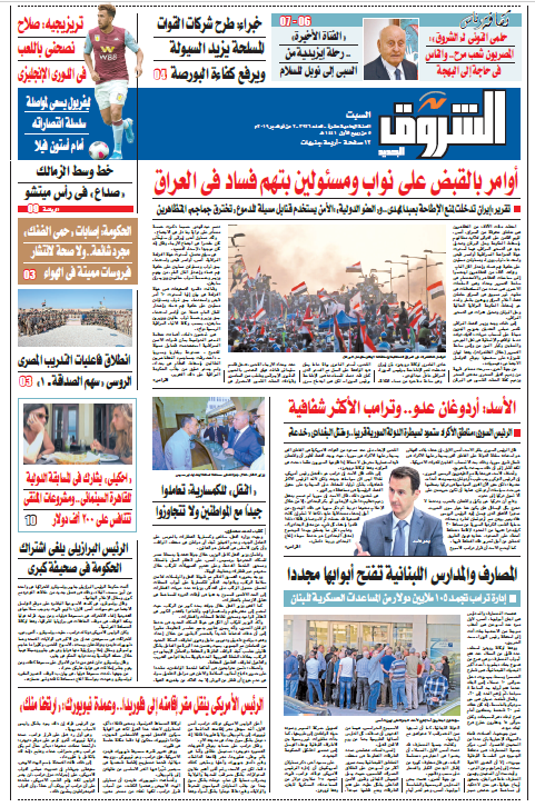 خامسا، الانحياز لجزار سوريا بشار الأسد وتواصل الحرب على تركيا حيث جاء في «مانشيت الأهرام»:… (تصعيد سورى ضد أنقرة.. والأسد: أردوغان ومجموعته أعداؤنا.. بلومبرج: تركيا وفرت ملاذا آمنا للبغدادي .. والعفو الدولية: إنها أرض الخوف). وفي كتبت «اليوم السابع»:… (بشار الأسد فى حوار مع التليفزيون السورى: أردوغان شخصية انتهازية وعندما قلت إنه «لص» لم أكن أشتمه لكنه وصف حقيقى) وتضيف «اليوم السابع»:… (مشاورات يقودها الرئيس العراقى لاختيار رئيس وزراء توافقى لامتصاص الغضب.. عبدالمهدى يبدى موافقته على الاستقالة.. وبرهم يوافق على انتخابات مبكرة). وفي «الشروق»:… (الأسد: أردوغان عدو.. وترامب الأكثر شفافية.. الرئيس السوري: مناطق الأكراد ستعود لسيطرة الدولة قريبا.. و"مقتل" البغدادي "خدعة"). وجاء غلاف الشروق في معظمه يتناول أخبارا خارجية وتراجعت نسبة المنشور عن الوضع الداخلي واهتم «مانشيت الشروق»:… بــ(أوامر بالقبض على نواب ومسئولين بتهم فساد في العراق .. تقرير: إيران تدخلت لمنع الإطاحة بعبدالمهدي ..و"العفو الدولية": الأمن يستخدم قنابل مسيلة للدموع تخترق "جماجم" المتظاهرين).