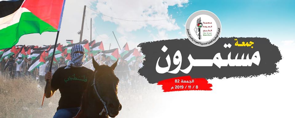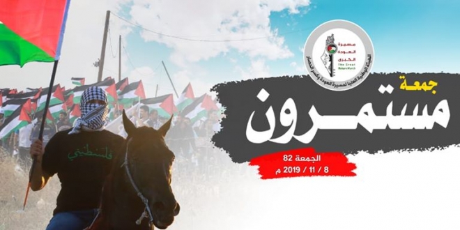 ويواصل أبناء الشعب الفلسطيني المشاركة في مسيرات العودة كل جمعة من الأسبوع؛ للمطالبة بحقهم العادل في العودة إلى الديار المحتلة.