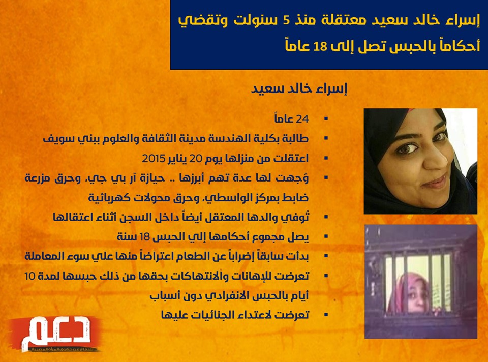 واعتقلت قوات الانقلاب إسراء خالد سعيد، في 20 يناير 2015، حيث لفقت لها اتهامات ومزاعم لا يقبلها عقل سليم، منها “حيازة آر بي جي، وحرق مزرعة ضابط بمركز الواسطى، وحرق محولات كهربائية”.