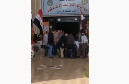 ويُظهر مقطع الفيديو عميد كلية الشريعة والقانون بتفهنا الأشراف وعددًا من رجال الأمن بالجامعة وهم يعتدون بالضرب على طالب بسبب تأخره عن موعد الامتحان.