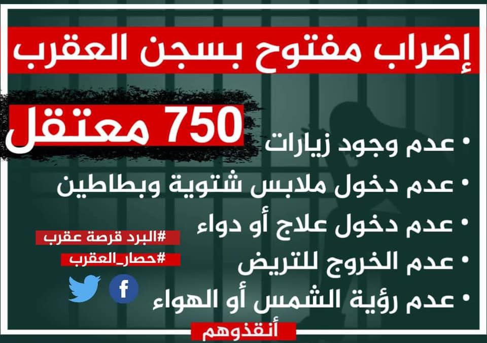 لليوم الثالث على التوالي يستمر إضراب معتقلي سجن العقرب عن الطعام بشكل كامل، على الرغم من بطونهم الخاوية وأجسادهم المنهكة نتيجة ظروف الاحتجاز المأساوية والتي تتنافى مع أدنى معايير حقوق الإنسان.
