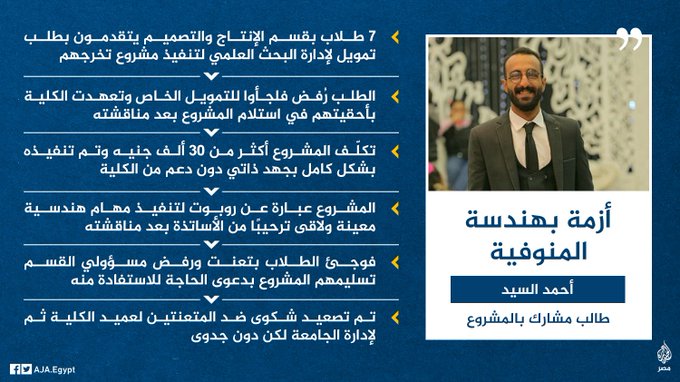 ونشر حساب “الجزيرة مصر” القصة قائلا: “طالب بـ”هندسة المنوفية” ينشر عن تعنت يواجهه في الكلية بعد تنفيذه مشروع تخرجه مع زملائه على نفقتهم الخاصة وتفاعل واسع عبر وسم #وقف_جبروت_دكاترة_الجامعات”.