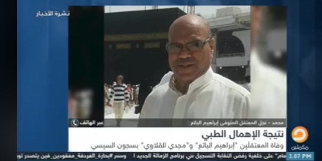 وقال محمد، نجل المعتقل إبراهيم الباتع: “إن والده (62 عاما) يعاني من أمراض السكر والضغط، وسبق اعتقاله عقب فض اعتصام رابعة العدوية، وأفرج عنه، ثم توالت مرات الاعتقال بعد ذلك أكثر من مرة، وكان قد تم اعتقاله لمدة شهر أو شهرين ثم أفرج عنه، وفي المرة الأخيرة أصيب بمرض الكحة الشديدة، وتمكنا من أخذ عينة من البلغم خلسة، وتم تحليلها وثبت إصابته بميكروب خطير، لكن إدارة السجن تعنتت في إجراء أشعة أو تحاليل له.