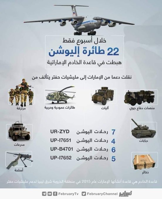 اعتبر ليبيون أن الدعم الدولي للانقلابي خليفة حفتر يمكّنه من استمرار ضربه بالمؤتمرات الدولية في سوريا وبرلين وجنيف واتفاقات الأمم المتحدة عرض الحائط، هذا ما كشفه “المركز الإعلامي لعملية بركان الغضب”، التابع لحكومة الوفاق، حيث أكد أن الإمارات دعمت حفتر بطائرات مسلحة بدون طيار، وشنّت غارات جوية بواسطة طائراتها المقاتلة، وأنها دعمتها أيضا بـ”الذخائر العنقودية” المحظورة بموجب اتفاقية الذخائر العنقودية التي صادقت عليها 108 دول، وهو سلاح سبق واستخدمه حفتر في 2015 في درنة، وأعاد استخدامه في قصف مواقع بطرابلس في نوفمبر الماضي.