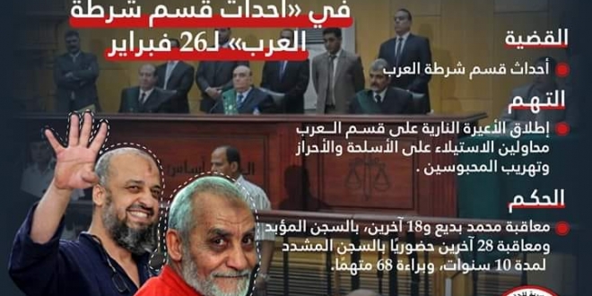 أجَّلت محكمة جنايات بورسعيد، المنعقدة بمجمع محاكم طرة، برئاسة قاضى العسكر سامي عبد الرحيم، اليوم الخميس 27 فبراير، جلسات إعادة محاكمة الأستاذ الدكتور «محمد بديع» المرشد العام للإخوان المسلمين، و46 آخرين من قيادات جماعة الإخوان، في القضية الهزلية المعروفة إعلاميا بـ«أحداث قسم شرطة العرب»، لجلسة 26 مارس المقبل، لاستكمال المرافعة.