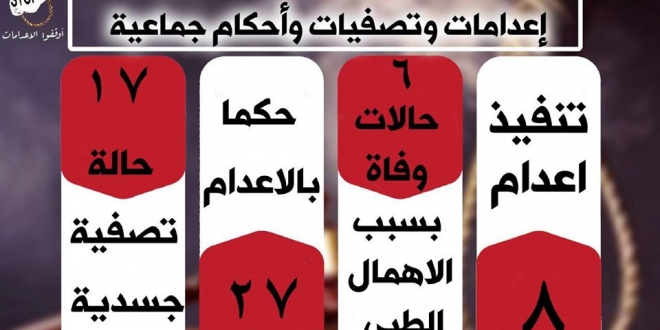 ورصد الإنفوجراف تنفيذ الإعدام لـ8 أبرياء، و6 حالات وفاة بسبب الإهمال الطبي، وصدور ٣٧ حكمًا بالإعدام، فضلا عن ١٧ حالة تصفية جسدية.