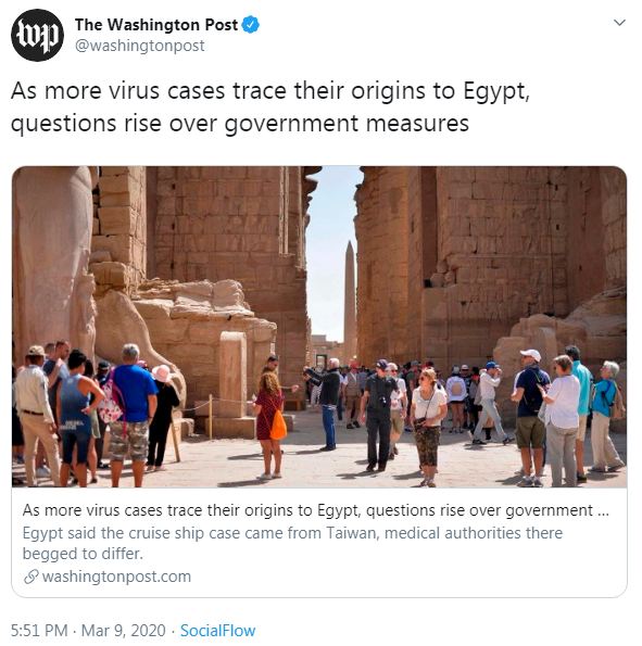 وفي تقرير للصحيفة بعنوان “مع ازدياد عدد حالات الإصابة بالفيروس إلى مصر ، تثور أسئلة حول الإجراءات الحكومية”، أشار إلى نموذج للتضليل بحالة الباخرة النيلية التي كان على متنها أمريكية تايوانية وقالت صحة الانقلاب “الحكومة” المصرية أن امرأة أمريكية تايوانية كانت مصدر عدوى فيروس كورونا لـ 45 راكباً وأفراد الطاقم على متن سفينة سياحية في النيل ، مما يشير إلى أن مصر كانت ضحية للانتشار العالمي للوباء.