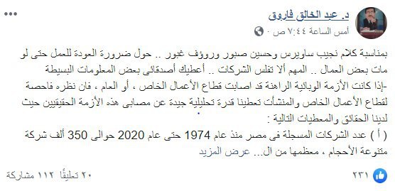 وكتب عبر فيسبوك، قائلا: “بمناسبة كلام نجيب ساويرس وحسين صبور ورؤوف غبور.. حول ضرورة العودة للعمل حتى لو مات بعض العمال.. المهم ألا تفلس الشركات.. أعطيك أصدقائى بعض المعلومات البسيطة”.