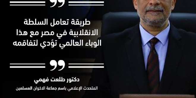 قال المتحدث الإعلامي لجماعة الإخوان المسلمين د. طلعت فهمي: إن طريقة تعامل السلطة الانقلابية في مصر مع وباء كورونا تؤدي إلى تفاقم الفيروس.