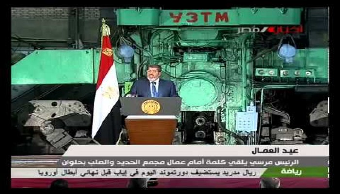 وتابع مرسي “نحن نمر الآن بالعبور الثالث، كما قلت سابقًا: العبور الأول كان في أكتوبر المجيد، والثاني في ثورة 25 يناير، والثالث هو عبور الإنتاج، اليوم نحتفل بالعمال وفي ذات الوقت أصحاب العمل أيضًا، ونحيي القطاع العام والخاص بكل ما فيه”، مشيرًا إلى زيارته لمجمع الحديد والصلب في حلوان الذي بدأت لبناته الأولى في القرن الماضي”.