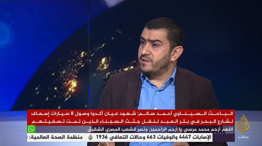 وأضاف سالم – في حواره مع برنامج "المسائية" على قناة "الجزيرة مباشر" – أن بيان الداخلية جاء قبل عملية التصفية بنصف ساعة، مطالبًا وزارة الداخلية إذا كان لديها الشجاعة الكافية أن تعلن عن أسماء الضحايا أو صورهم حتى يتعرف الأهالي على أسمائهم، كما حدث في حادث تصفية شباب العريش الذي جاء للثأر من الهجوم على كمين المطافي، وعندما أعلنت الداخلية الأسماء ونشرت الصور كشف الأهالي عن اعتقال الضحايا من قبل على يد داخلية السيسي؛ ما دفع الداخلية لعدم الإعلان عن الأسماء أو نشر الصور بعد ذلك.