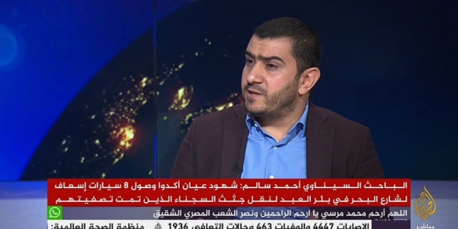 وأشار أبو هنية إلى أنه إذا تتبعنا ما يتحدث به المتحدث العسكري عن قتلى تنظيم داعش والمعتقلين في سيناء نجده يتحدث عن أكثر من 5000 قتيل وأكثر من 6 آلاف معتقل في الوقت الذي أكدت فيه الأجهزة الأمنية المصرية أن تنظيم ولاية سيناء يبلغ عدد أعضائه ما بين 700 إلى ألف عنصر، مضيفا أن سيناء باتت صندوقا أسود؛ لأن السيسي يفرض تعتيما كاملا عليها، وسبق أن اعتقل الباحث إسماعيل الإسكندراني لنشره معلومات عن الوضع في سيناء، لافتا إلى أن ملف سيناء يتم استثماره سياسيا من قبل نظام السيسي وكأنه لا يراد له أن ينتهي على الإطلاق.
