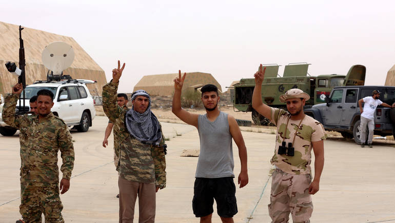 Members of Libya's internationally recognised government flash victory signs after taking control of Watiya airbase, southwest of Tripoli, Libya May 18, 2020. REUTERS/Hazem Ahmed