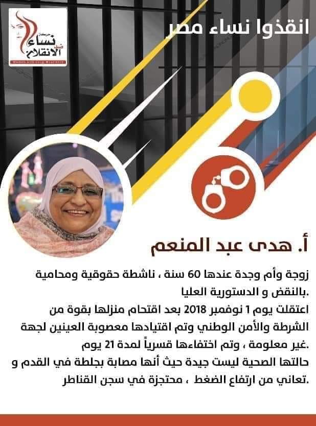 وقالت الحركة: "أنقدوا نساء مصر"، وأشارت إلى أن الناشطة الحقوقية هدى عبد المنعم، زوجة وأم وجدة، تبلغ من العمر 60 عاما، وهى محامية بالنقض والدستورية العليا.