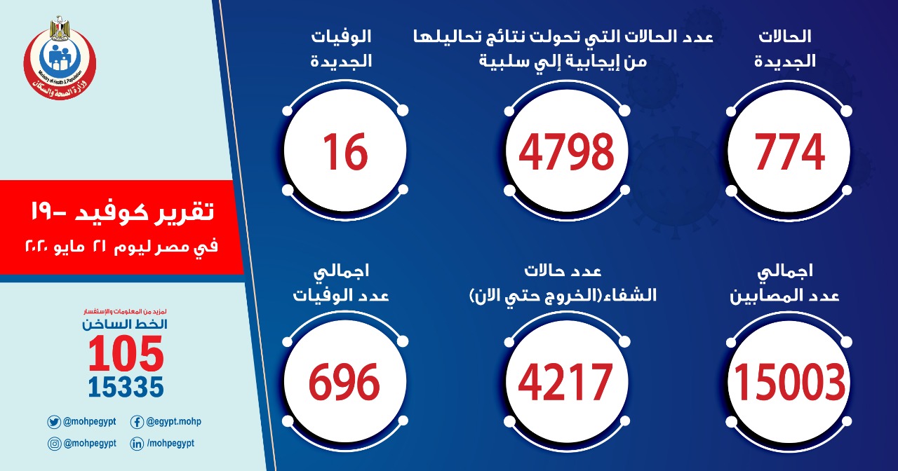 أعلنت وزارة الصحة والسكان بحكومة الانقلاب، اليوم الخميس، عن تسجيل 774 حالة جديدة ثبتت إيجابية تحاليلها معمليًا للفيروس، ووفاة 16 حالة جديدة.