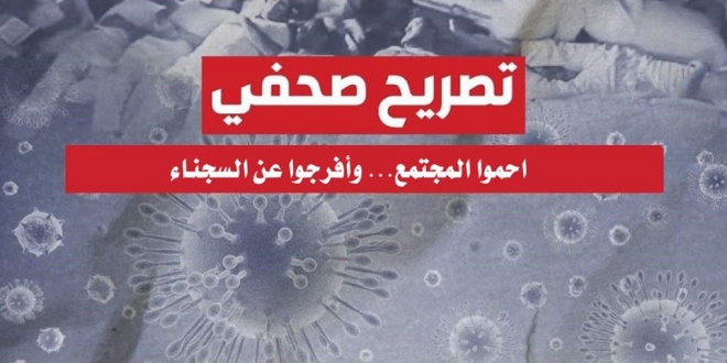 أطلقت 3 منظمات حقوقية، اليوم، نداءً جديدا للمسئولين بحكومة الانقلاب بعنوان "احموا المجتمع… وأفرجوا عن السجناء"، يجدد المطالبة بضرورة اتخاذ خطوات وتدابير احترازية، تعمل على الحد من انتشار الفيروس داخل أماكن الاحتجاز، وخطورة انتقاله للمجتمع الخارجي نتيجة مخالطة الإداريين والضباط خارج وداخل هذه الأماكن.