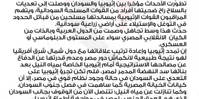 وقال المجلس، في بيان لها، إن "تطورت الأحداث مؤخرا بين إثيوبيا والسودان وصلت إلى تعديات بالسلاح راح ضحيتها أفراد من القوات المسلحة السودانية، ويتهم المراقبون القوات الإثيوبية بمساندتها مسلحين من قبائل الحدود في التوغل والاستيلاء على أراضٍ زراعية سودانية"، مشيرا إلى حدوث هذا وسط تجاهل وصمت من الدول العربية وخاصة نظام الانقلاب في مصر، سواء على المستوى الدبلوماسي أو العسكري.