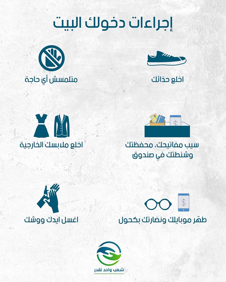 وفي سجل نصائحها اليومية، نشرت الصفحة الواجبات أو الفروض الواجب اتباعها حال عودة العودة للمنزل، وأوصت حال الرجوع للبيت بالحفاظ على الإنسان وأهله، بتسلسل "اخلع حذاءك وتجنب لمس أي حاجة، وخلع الملابس الخارجية، وترك محفظتك ومفاتيحك وشنطتك في صندوق، وتطهير نظارتك وموبايلك بكحول، واغسل إيدك ووشك".