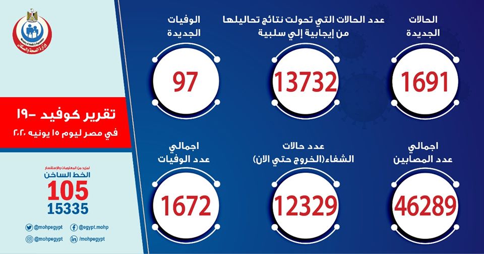 1691 إصابة و97 وفاة جديدة.. إصابات “كورونا” في مصر تتجاوز 46 ألفًا