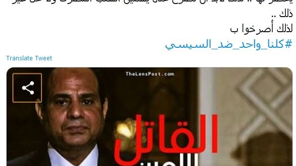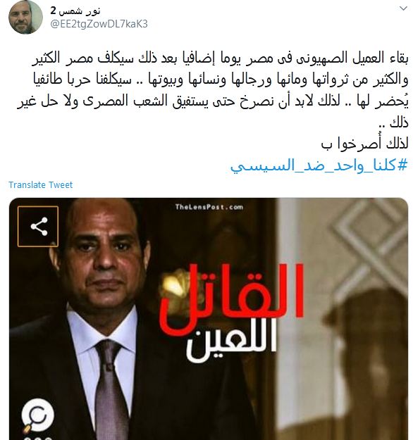 أما حساب "نور شمس 2" فكتبت أن "بقاء العميل الصهيونى فى مصر يوما إضافيا بعد ذلك سيكلف مصر الكثير والكثير من ثرواتها ومائها ورجالها ونسائها وبيوتها .. سيكلفنا حربا طائفيا يُحضر لها .. لذلك لابد أن نصرخ حتى يستفيق الشعب المصرى ولا حل غير ذلك ..لذلك أُصرخوا ب#كلنا_واحد_ضد_السيسي".