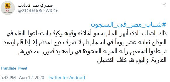 وقال حساب "مصري ضد الانقلاب": "ذاك الشباب الذي أبهر العالم بسمو أخلاقه وقيمه وكيف استطاعوا البقاء في الميدان ثمانية عشر يوما في انسجام تام لا تعرف دين أحدهم إلا إذا قام ليتعبد ثم عادوا لتجمعهم راية الحرية المنشودة في رابعة يدافعون بصدورهم العارية. واليوم هم خلف القضبان".