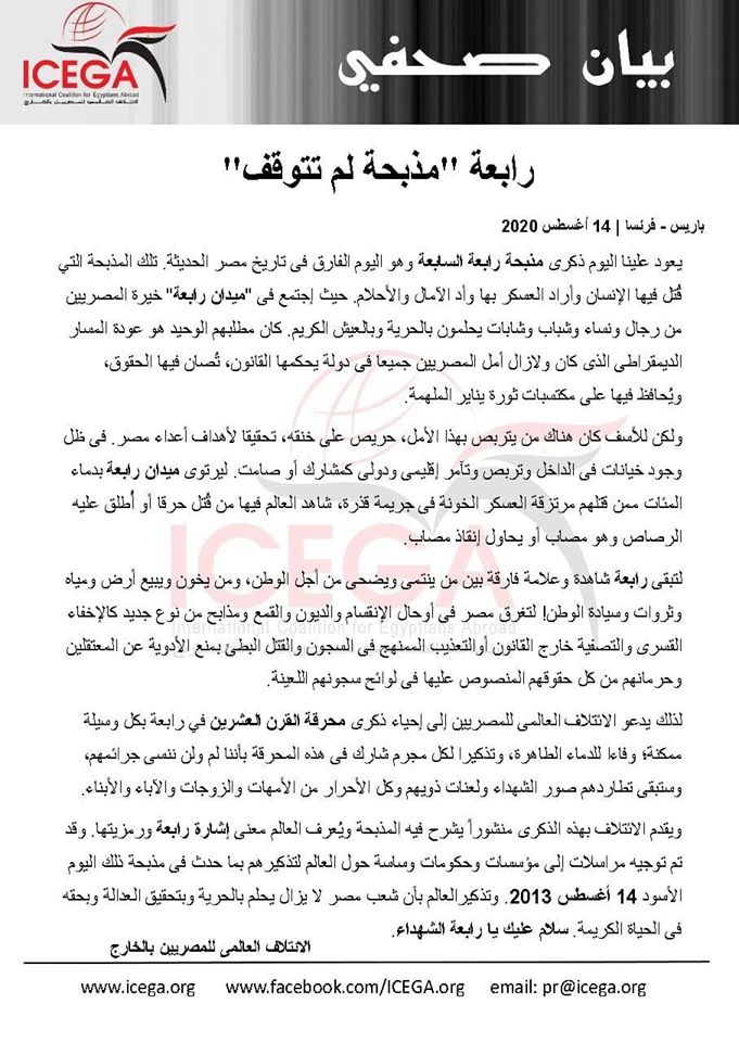 كما دعا الائتلاف، في بيان صادر عنه اليوم، إلى إحياء ذكرى مذبحة القرن العشرين في رابعة العدوية بكل وسيلة ممكنة وفاء لدماء الشهداء الأطهار مؤكدين انهم لم ولن ينسوا جرائم كل من شارك فى هذه المذبحة.