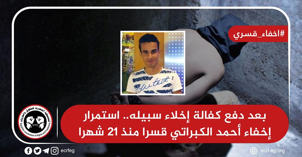 كانت التنسيقية قد وثقت استمرار إخفاء قوات الانقلاب بمحافظة البحر الأحمر، بحق المواطن أحمد سعد محمد الكبراتى، الطالب في كليه الحقوق جامعة الإسكندرية، للشهر الحادي والعشرين على التوالي بعد حصوله على حكم قضائي بإخلاء سبيله على ذمة القضية رقم ٧٧ إداري الشلاتين يوم 6 ديسمبر 2018 بكفالة مالية 20 ألف جنيه.