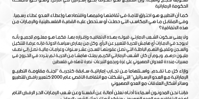 وأشار إلى أنه "يوم أن كان الشعب الإماراتي الكريم يملك هامشا من الحرية لم يتردد في الخروج في مسيرات منددة بالعدوان الصهيوني على غزة وجمع التبرعات نصرة لأهله في فلسطين"، موضحا أن تجارب إماراتية سابقة كتجربة "لجنة مقاومة التطبيع الإماراتية مع العدو الإسرائيلي" التي تشكلت مع انتفاضة الأقصى عام 2000 كانت تعبيرا رافضا للتطبيع وسائر أشكال العلاقات مع العدو الصهيوني.