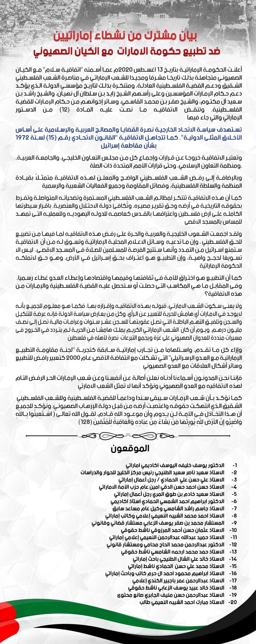 أصدر نشطاء ومثقفون إماراتيون بيانا مشتركا "ضد تطبيع حكومة الإمارات مع الكيان الصهيوني" يعتبرون أن إعلان الحكومة الإماراتية بتاريخ 13 اغسطس 2020م، عما أسمته "اتفاقية سلام" مع الكيان الصهيوني تتجاهل بذلك تاريخا مشرفا ومجيدا للشعب الإماراتي في مناصرة الشعب الفلسطيني الشقيق ودعم القضية الفلسطينية العادلة.