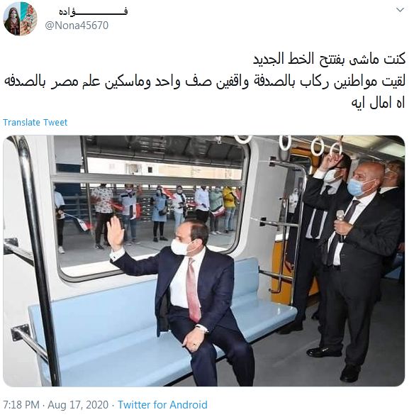 وعلق الحقوقي عمرو عبد الهادي قائلا: "في اليوم اللي أردوغان بيتفقد بناء مطار ثاني فوق البحر يتفقد السيسى إنشاء محطة مترو باسم الطرطور المحلل عطية منصور.. حشد معيزه بالملايين لافتتاح محطة مترو باسم الطرطور بكره نغيرها ونسميها محطة شهداء رابعة.. تركيا ليها رئيس ومصر ليها سيسي".