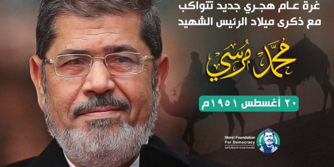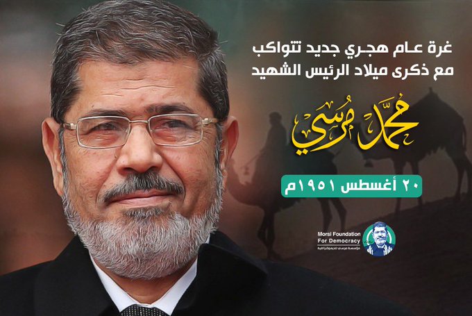 مؤسسة مرسى الديمقراطية قالت: مع غرة عام هجري جديد تحل ذكرى ميلاد الرئيس الشهيد الدكتور #محمد_مرسي رحمه الله أول رئيس مدني منتخب في تاريخ #مصر، والذى ولد في الـ٢٠ من أغسطس عام ١٩٥١م، مؤسسة مرسي للديمقراطية تهنئ الأمة العربية والإسلامية بالعام الهجري الجديد لسنة١٤٤٢هـ وتجدد عزمها السير على درب الرئيس رحمه الله.
