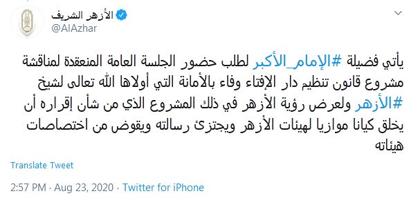 تصدر هاشتاج #ادعم_الأزهر موقع التواصل الاجتماعي للتغريدات القصيرة "تويتر" قبيل إعلان سحب قانون تنظيم دار الإفتاء قبل التصويت عليه في البرلمان، وذلك بعد معركة خاضها الأزهر وشيخه أحمد الطيب دفاعًا عن استقلاليته ورفضًا لتهميشه وتقليص دوره فخرج منها منتصرًا، برأي المراقبين.