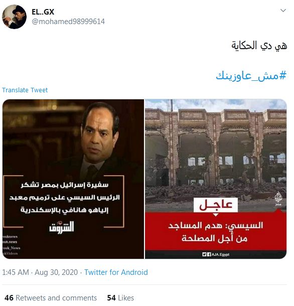 وساخرا كتب "هيثم أبوخليل"، "عايزين نجامل آل زايد وآل سعود .. علشان وقفوا مع مصر وكده!.. يتم إرسال السيسي إعارة 5 سنوات للإمارات .. وبعدها.. إعارة 5سنوات للسعودية.. لكي ينقلهم نقلة كبيرة زي ما مصر إنتقلت لحته تانية وبقت دولة تانية في 30/6/2020.. ليضع الإمارات في حته تانية.. في 2025.. والسعودية في حته تانية.. في 2030". وكتب الإعلامي "إسلام عقل"، "قال: لو الشعب قالي ارحل هرحل .. قالوله : #ارحل_يا_سيسي.. رجع قال: لو مش عايزني اعملوا استفتاء و همشي.. قالوله : #مش_عايزينك #مش_عاوزينك ".