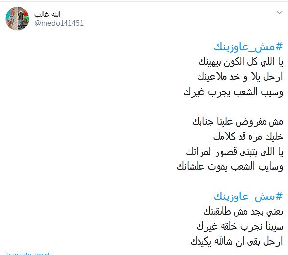 أما حساب "الله غالب" فاستدعى بعض الرباعيات ومنها "#مش_عاوزينك يا اللي كل الكون بيهينك .. ارحل يلا و خد ملاعينك .. وسيب الشعب يجرب غيرك .. مش مفروض علينا جنابك ..خليك مره قد كلامك.. يا اللي بتبني قصور لمراتك .. وسايب الشعب يموت علشانك .. #مش_عاوزينك .. يعني بجد مش طايقينك .. سيبنا نجرب خلقه غيرك .. ارحل بقى ان شالله يكيدك".