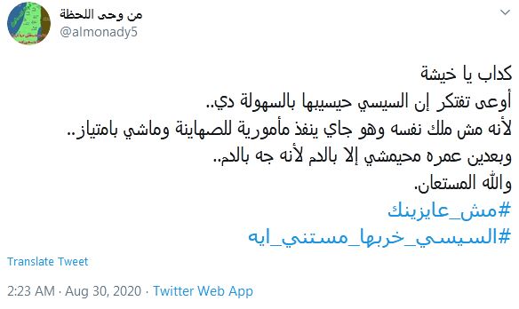 وأضاف حساب "اعرآبي صقر العرب" "#ولكنك لا تعرف يا بلحه .. إن الحطابون في الجبال النائية، والفلاحون في مزارعهم، والعجائز حول نار المدافأ في ليالي الشتاء،وملايين البسطاء والشباب الجالس على المقاهي وخلف الشبابيك الحديد، وأمهات الشهداء، والمرضي داخل المستشفيات الحكومي ، وماما فيفي وحمو بيكا وخالتي انشراح .. #مش_عاوزينك". وكتب أحمد يوسف "كفاية فقر.. كفاية هدم .. كفاية محسوبية وفساد وظلم وقتل".