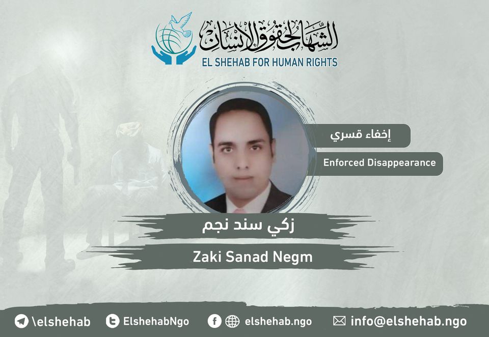 ووثق مركز الشهاب لحقوق الإنسان اليوم جريمة إخفاء زكي سند نجم، مهندس بالشركة الهندسية بالعبور يبلغ من العمر 33 عاما وهو من أبناء مركز أبو حماد محافظة الشرقية، منذ اعتقاله يوم الإثنين 31 أغسطس 2020 من منزله بعد العبث بمحتويات المنزل والاستيلاء على أجهزة أسرته، ولم يستدل على مكانه حتى الآن.