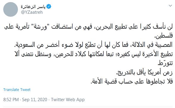 وعبّر الكاتب والمحلل السياسي الفلسطيني ياسر الزعاترة عن رفضه للاتفاق واستدرك "لن نأسف كثيرا على تطبيع البحرين، فهي من استضافت "ورشة" تآمرية على فلسطين.. المصيبة في الدلالة، فما كان لها أن تطبّع لولا ضوء أخضر من السعودية.. تطبيع الأخيرة ليس كغيره؛ تبعا لمكانتها كبلاد للحرمين، وسنظل نتمنى ألا تتورّط.. زمن أمريكا يأفل بالتدريج.. فلا تجاملوها على حساب قضية الأمة".