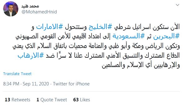 وأضاف الأكاديمي التونسي د.محمد هنيد "الآن ستكون اسرائيل شرطي #الخليج وستتحول #الامارات و #البحرين ثم #السعودية إلى امتداد إقليمي للأمن القومي الصهيوني وتكون الرياض ومكة وأبو ظبي والمنامة محميات باتفاق السلام الذي يعني الدفاع المشترك والتنسيق الأمني المشترك علنا لا سرًّا ضد #الارهاب والإرهابيين أي الإسلام والمسلمين".