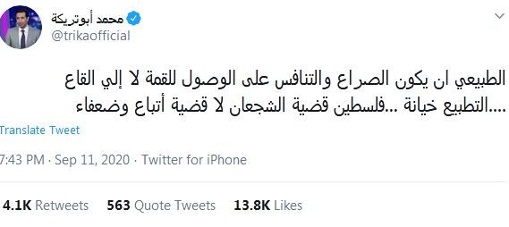 ومن أبرز التعليقات على الاتفاق البحريني تغريدة على "تويتر" كتبها اللاعب الدولي المصري محمد أبوتريكة قائلا: "الطبيعي أن يكون الصراع والتنافس على الوصول للقمة لا إلى القاع.. التطبيع خيانة.. فلسطين قضية الشجعان لا قضية أتباع وضعفاء".