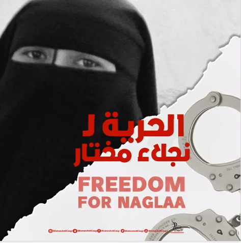 بالتزامن مع انعقاد غرفة مشورة اليوم لتجديد حبس المعتقلة " نجلاء مختار يونس " في القضية رقم 1327 لسنة 2018 حصر أمن دولة، جددت حركة نساء ضد الانقلاب المطالبه بالحرية لها ولجميع الحرائر القابعات فى سجون نظام السيسى المنقلب.