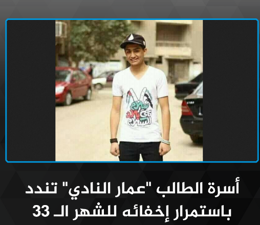 وأوضحت أسرة عمار "طالب جامعي 21 عاما" أنها قامت بعمل محضر اختفاء وإرسال تلغرافات للنائب العام ووزير الداخلية بحكومة الانقلاب ، إلا أنها لم تستدل على مكانه حتي الآن.