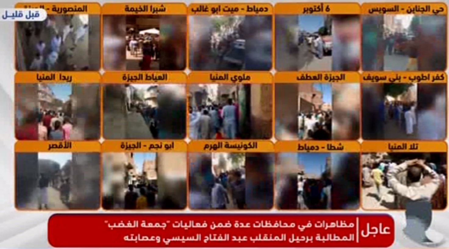 أكثر من 150 مظاهرة انطلقت من بعد صلاة #جمعة_الغضب وحتى الساعات الأولى من صباح السبت شملت 13 محافظة، منها الجيزة والقاهرة والإسكندرية ودمياط والمنوفية والقليوبية والإسماعيلية والسويس وبنى سويف و أسيوط وأسوان والاقصر والمنيا، تطالب برحيل السيسى وعودة الحقوق المغتصبة ووقف العبث بمقدرات البلاد ورفع الظلم المتصاعد يوما بعد الآخر.