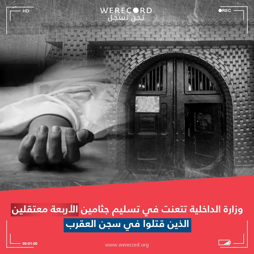 وقال فريق نحن نسجل الحقوقى إنه علم أن وزارة الداخلية بحكومة الانقلاب ما زالت ترفض تسليم جثامين الأربعة معتقلين الذي أعلن عن مقتلهم داخل #سجن_العقرب إلى ذويهم.