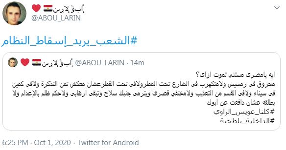 وقال حساب "لله الأمر": "انتصر المصريون علي اسرائيل في اكتوبر 73 .واكتوبر 2020 يطالبكم ايها المصريون بتحرير مصر واستردادها من قبضة الاماراتيين والاسرائيليين ومحاكمة عملائهم الخونه وذراعهم اليمني بمصر . اجعلوا اكتوبر شهر الانتصارات للشعب المصري ضد اعدائه".