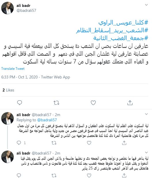 أما علي بدر فاتفق مع الدعوات للنزول للتحرير واتهم الرافضين بالجبن فقال "عارفين ان ساعات بحس ان الشعب دة يستحق كل اللى بيعمله فية السيسي و عصابتة عارفين لية علشان الجبن اللى فى دمهم والصمت اللى قافل افواههم والغباء اللى متملك عقولهم سؤال من 7 سنوات بساله لية السكوت".